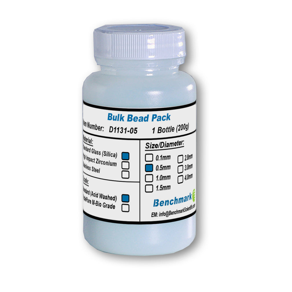 These 0.5 mm silica (glass) beads are ideal for homogenizing bacteria, fungi, spores, molds, and small yeasts. Acid washed, heat treated, and ready to use. Supplied in 200 g bottles, compatible with Benchmark and other bead homogenizers. Also offered in prefilled tubes (D1031-05)