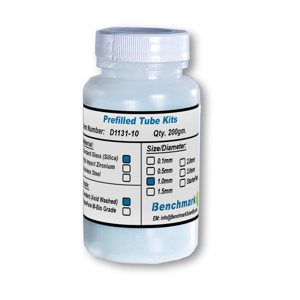 These 1.0 mm silica (glass) beads are ideal for homogenizing bacteria, fungi, spores, molds, and small yeasts. Acid washed, heat treated, and ready to use. Supplied in 200 g bottles, compatible with Benchmark and other bead homogenizers. Also offered in prefilled tubes (D1031-10)