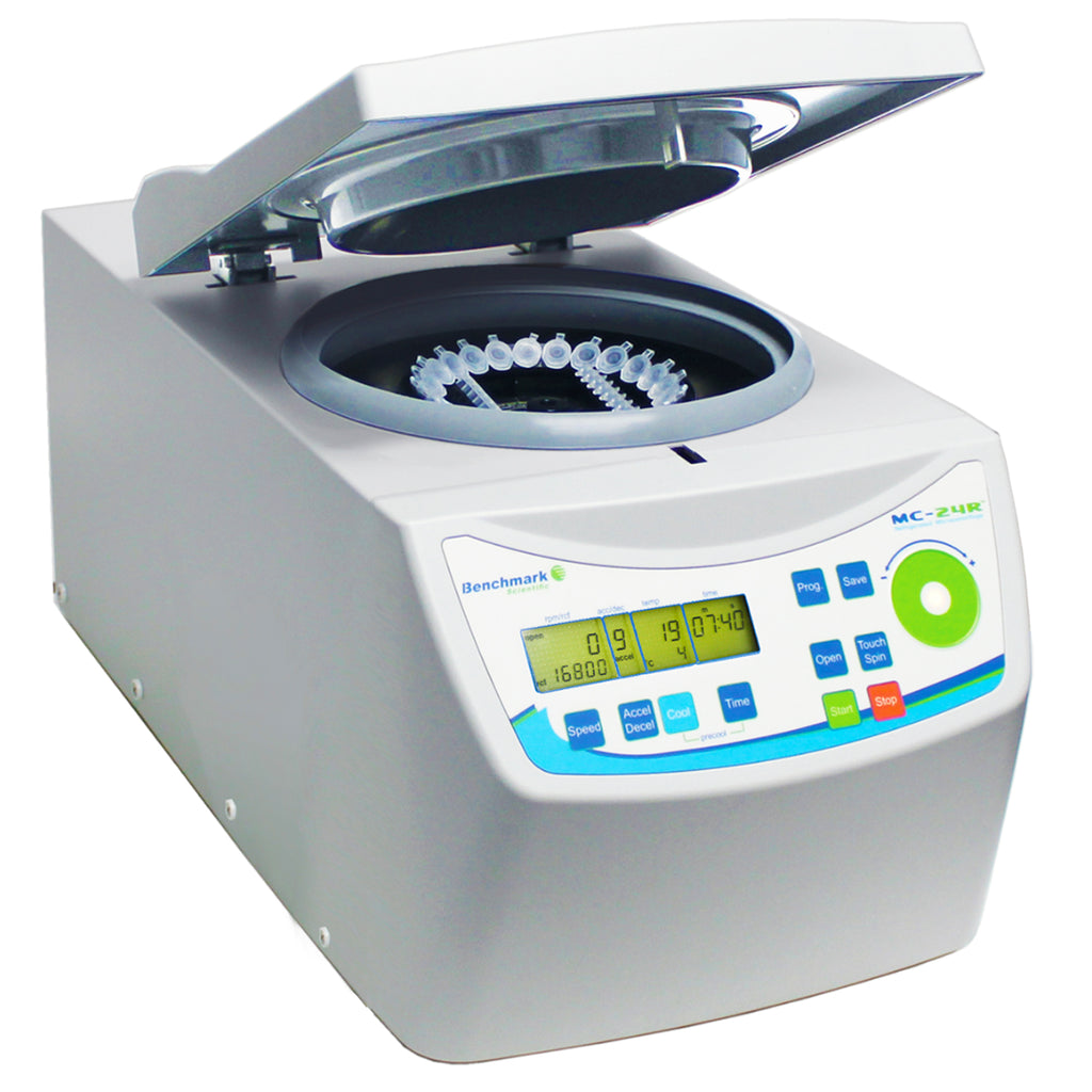 The Benchmark MC-24R refrigerated micro-centrifuge features a touch screen, high-speed spins up to 13,500 rpm, and a COMBI-Rotor for 0.2–2 mL tubes. It offers adjustable acceleration, program storage for 99 runs, real-time rpm/rcf display, and a status light, making it a compact, versatile, and reliable centrifuge for molecular biology labs