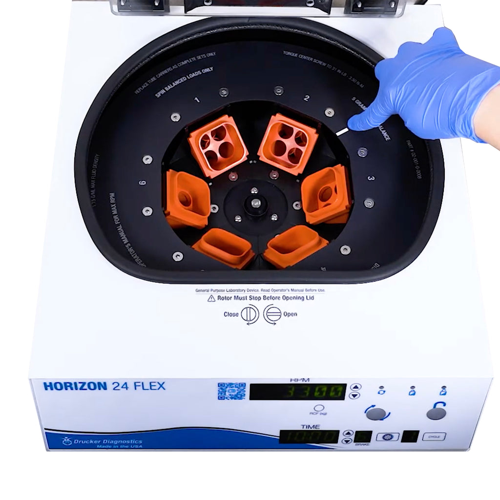 The Drucker® Horizon™ 24 Flex is a reliable, high-capacity centrifuge built for everyday lab demands. Engineered for versatility and ease of use, it accommodates all blood and urine tubes up to 50 mL straight out of the box. The intuitive digital interface allows users to save up to 10 custom cycles or select from three optimized presets. Its LED lid lighting system clearly displays operational status—off when ready, on during spin, and flashing when complete—helping ensure no samples are forgotten and results remain accurate