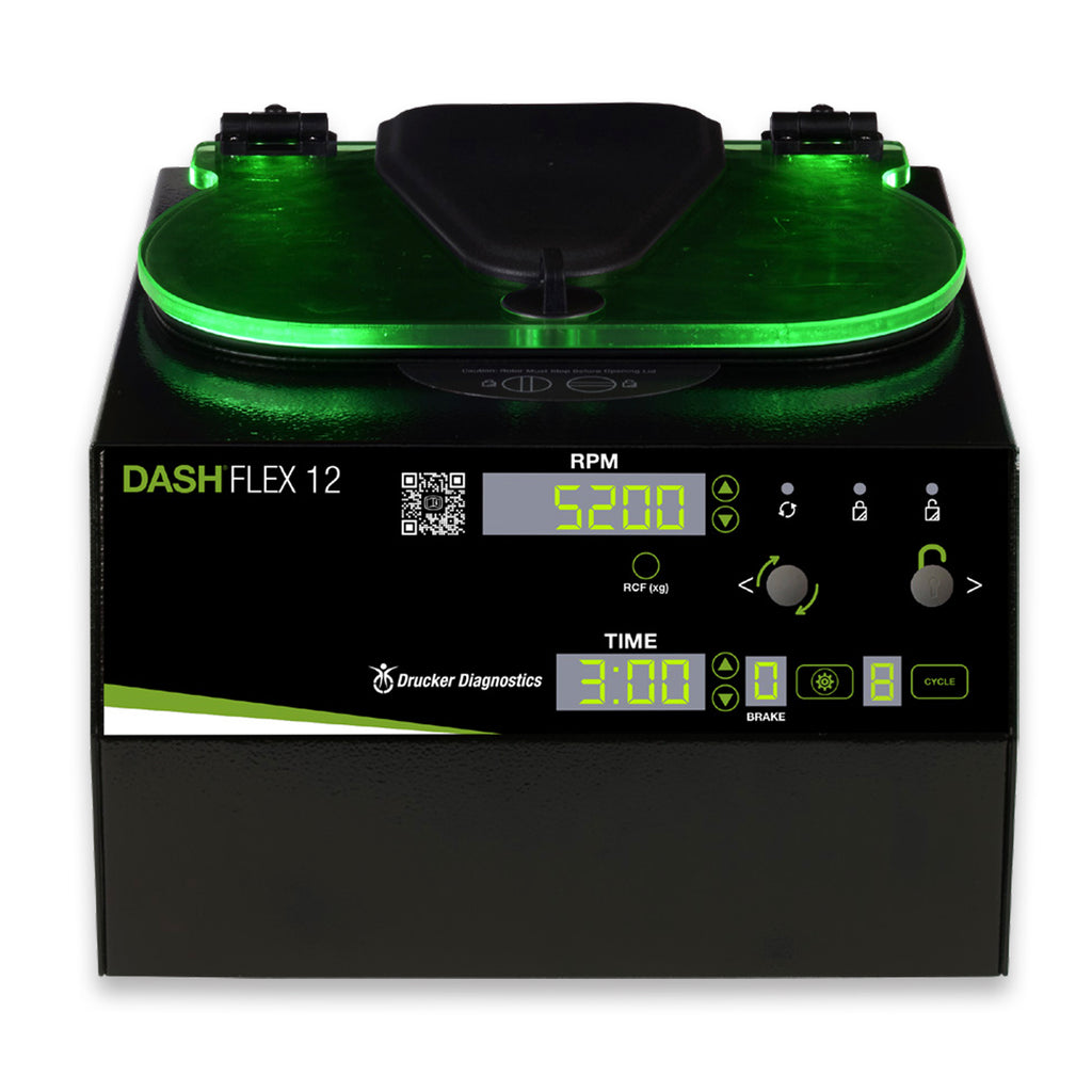The Drucker® DASH Flex 12 STAT centrifuge helps speed up turnaround times with clear green lid lights visible from across the lab—flashing when the cycle is complete, steady when running, and off when ready—minimizing the risk of samples being overlooked. It stores up to 10 programmable cycles, allowing you to customize acceleration, deceleration, speed, g-force, and runtime, all displayed digitally along with the remaining cycle time