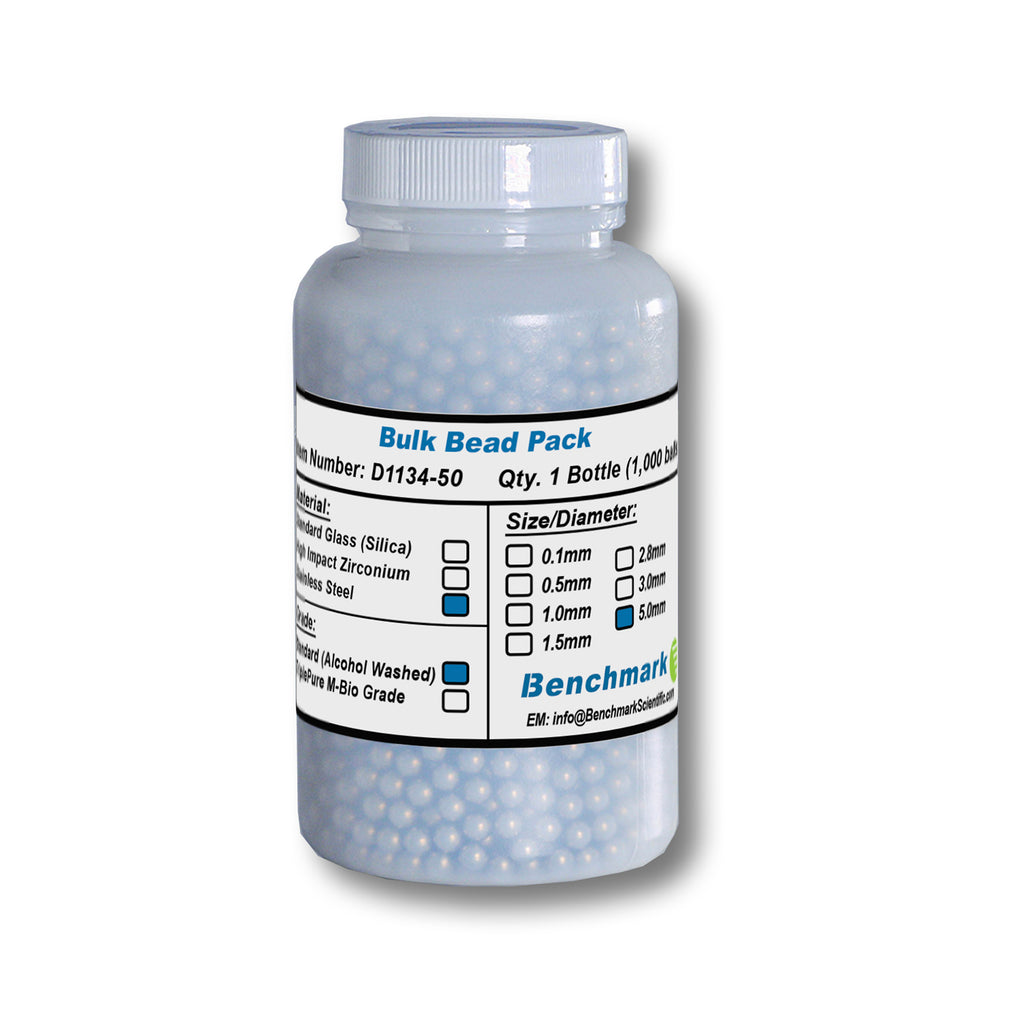 These 5 mm steel beads are ideal for homogenizing tough tissues, plants, seeds, and dried samples. Alcohol washed, heat treated, and ready to use. Supplied in packs of 1,000, compatible with Benchmark and other homogenizers