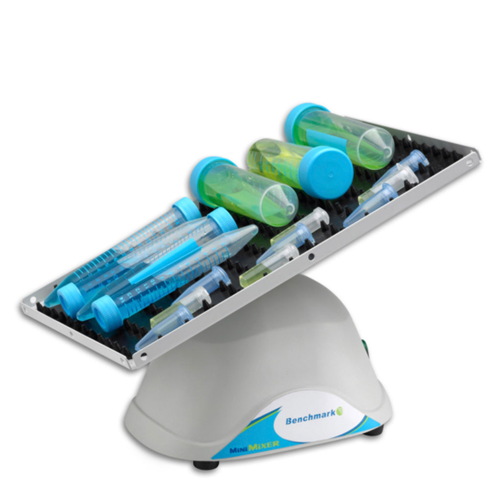 The Benchmark Scientific® MiniMixer™ & BioMixer™ versatile shakers provide a gentle 3-dimensional “nutating” motion for thorough, foam-free mixing of blood and centrifuge tubes, as well as various flat vessels. Each model includes an autoclavable dimpled mat, with optional flat mats available for other vessel types.