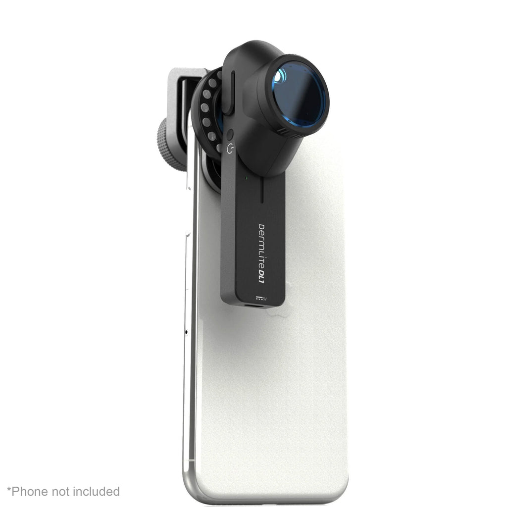 The DermLite® DL1™ brings advanced polarized illumination into a compact digital dermoscopy tool made for smartphones and tablets. Featuring a full-size 15 mm lens, powerful LEDs, and a rechargeable battery, it fits in an all-aluminum body smaller than a finger.