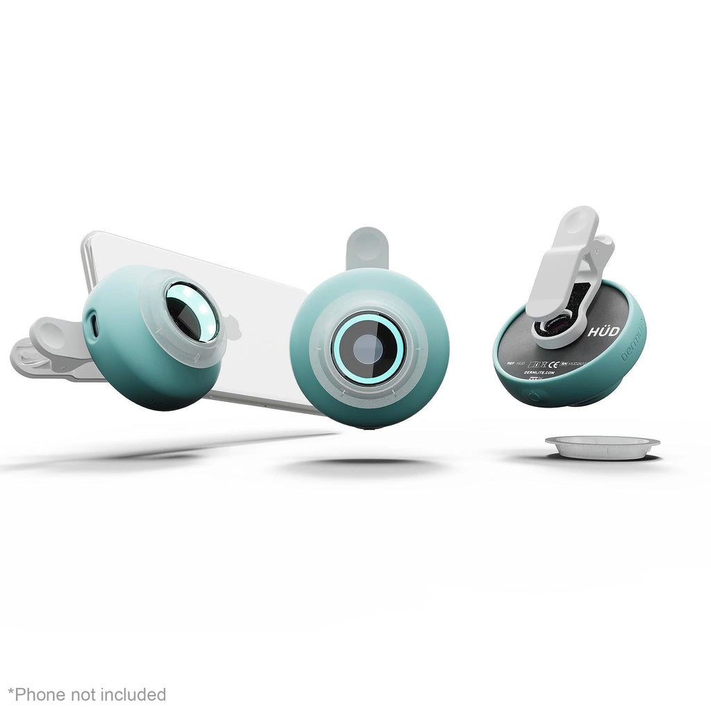 The HÜD 2™ set includes a polarized, USB-rechargeable skin magnifier, universal smartphone clip, two IceCap® disposable contact caps, a microfiber pouch, and a USB to Micro USB charging cable.