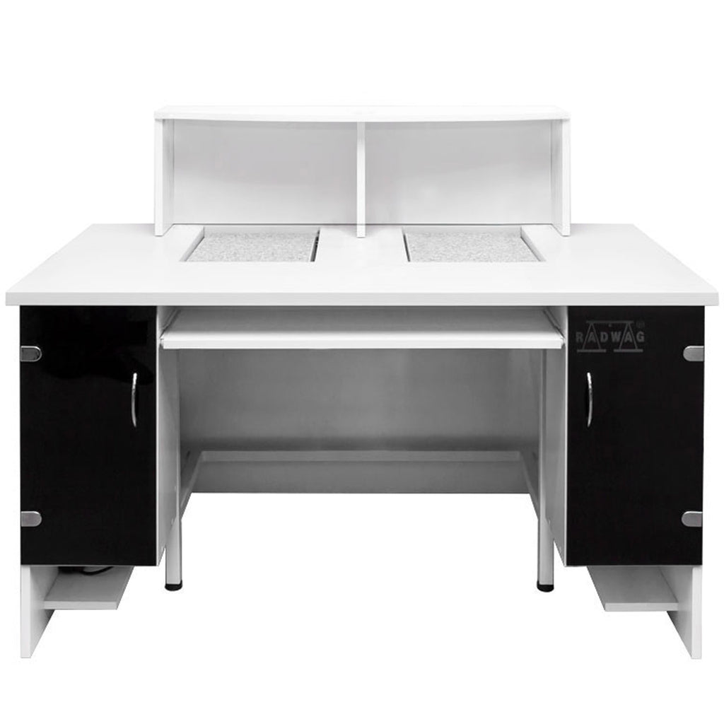 The Radwag PSW/Dual (WX-001-0402) workstation supports two micro or analytical balances. It features dual stone tops, anti-vibration design, two lockers, sliding shelf, monitor base, ventilation, rubber-tipped feet, a steel frame, and MDF working areas
