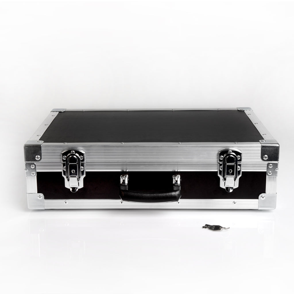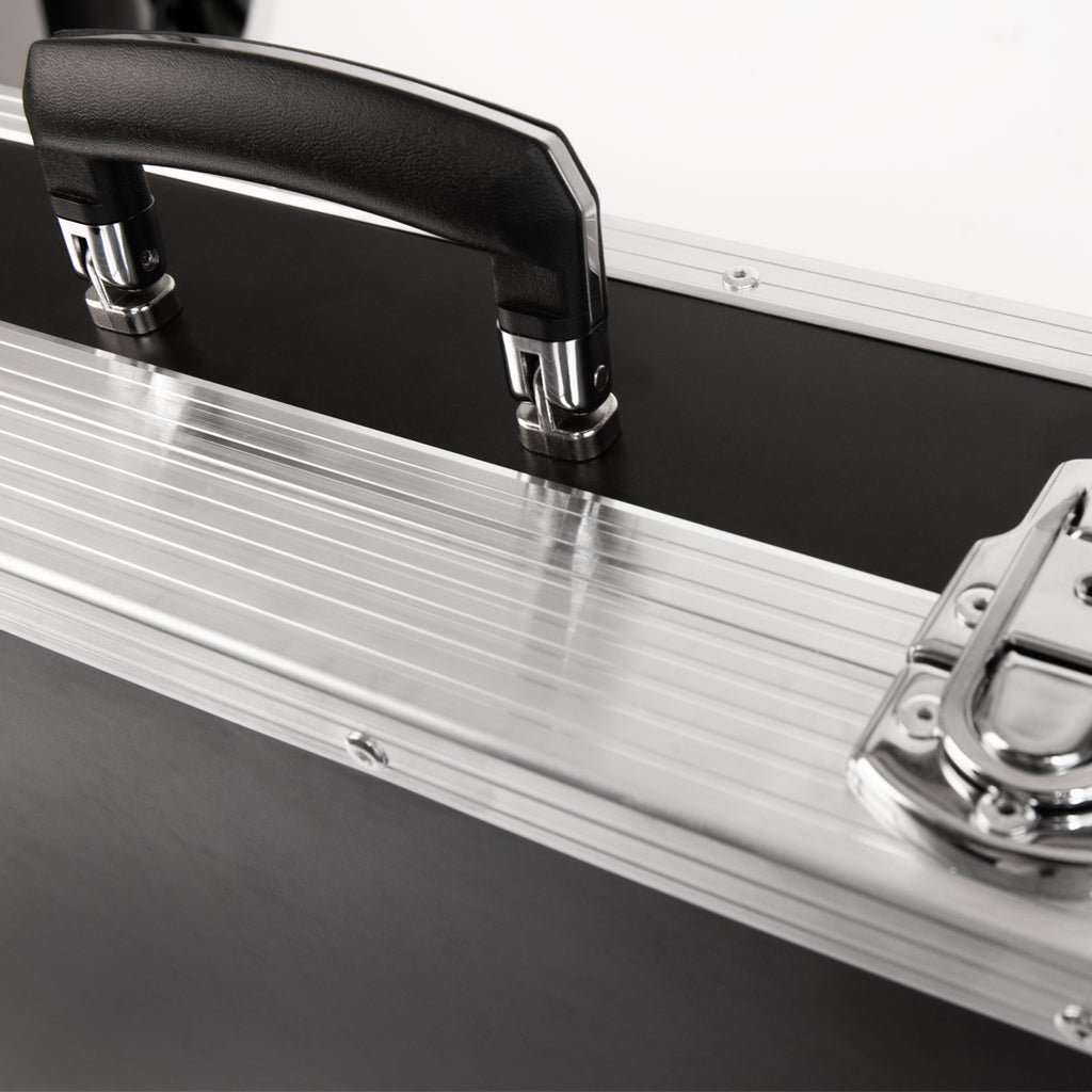 The case is specifically designed to safely transport PS and WLC (A1 and A2) series balances. Constructed from 6 mm thick plywood, it features reinforced corners, an aluminum exterior, and a dense dark foam interior for added protection. It includes a single handle for easy one-person carrying and is secured with two key-lockable latches